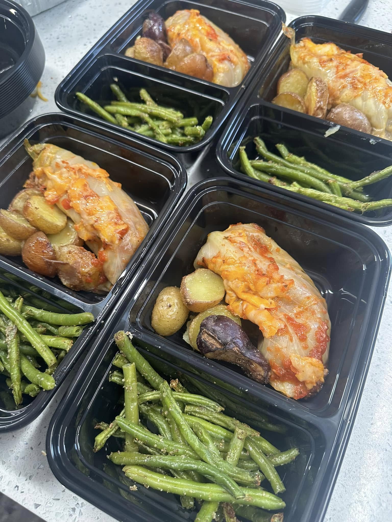 Tender cabbage leaves stuffed with a savory blend of seasoned meat and rice, baked in a rich tomato sauce for a classic comfort dish. Served alongside roasted baby potatoes and garlic-seasoned green beans, this wholesome meal brings a taste of homestyle cooking to your table.