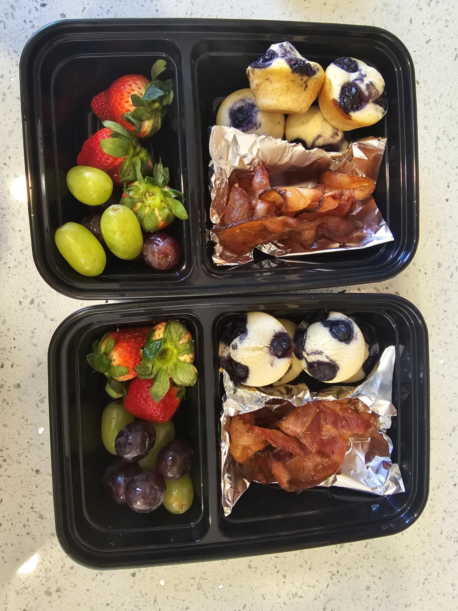 Fluffy blueberry pancake bites paired with crispy, savory bacon strips for the perfect balance of sweet and salty. Served with a fresh fruit medley of strawberries, grapes, and more — this breakfast box packs energy, flavor, and satisfaction to fuel your morning.