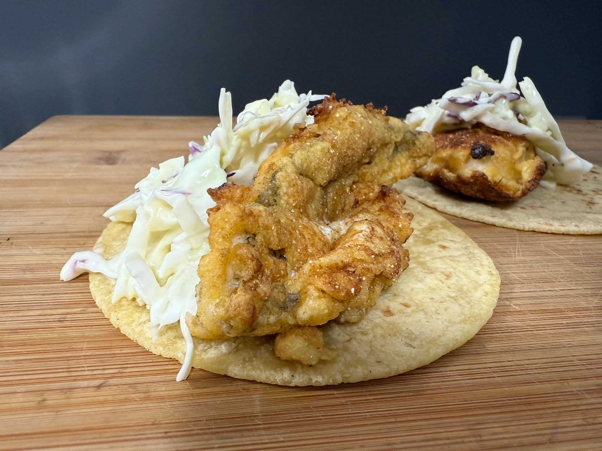 golden brown in a corn flour tortilla with coleslaw and a side of waffle fries .